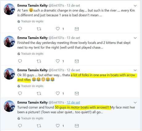 Esta é a última postagem da atleta britânica Emma Tamsin Kelty, de 43 anos, no Twitter. Foi ao ar na madrugada da última quarta-feira, 13 de setembro - desde o mês passado ela viajava pelo rio Amazonas em um caiaque, em uma jornada que começou no Peru e foi interrompida entre as cidades de Codajás e Coari (AM), na beira do rio, com o desaparecimento dela.